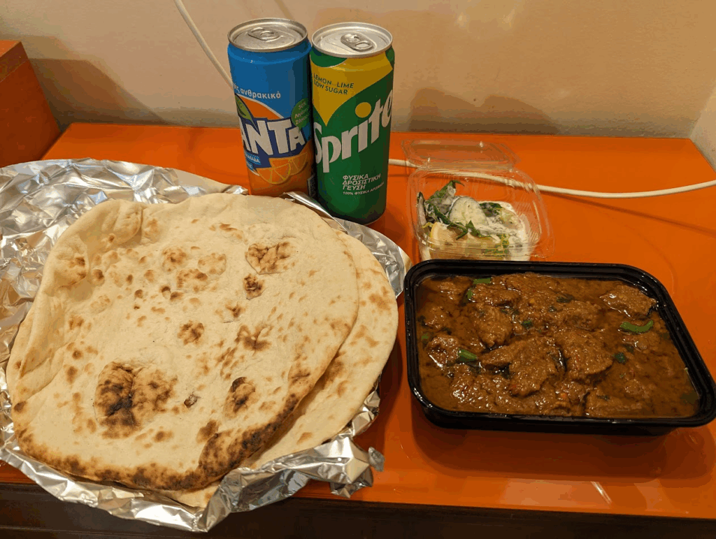 部屋に戻り、買ってきた料理を広げる。牛肉の煮込みと、ナンのようなパン。スプーンは付いていなかったので、手でつかんで豪快に食べることにした。肉はゴロゴロ入っていて柔らかく、旨味はしっかりある。だが――めちゃくちゃ辛い。 この季節、この気候では炭酸飲料で流し込むのがいちばん合っている。そう自分に言い聞かせながら、夢中で完食。