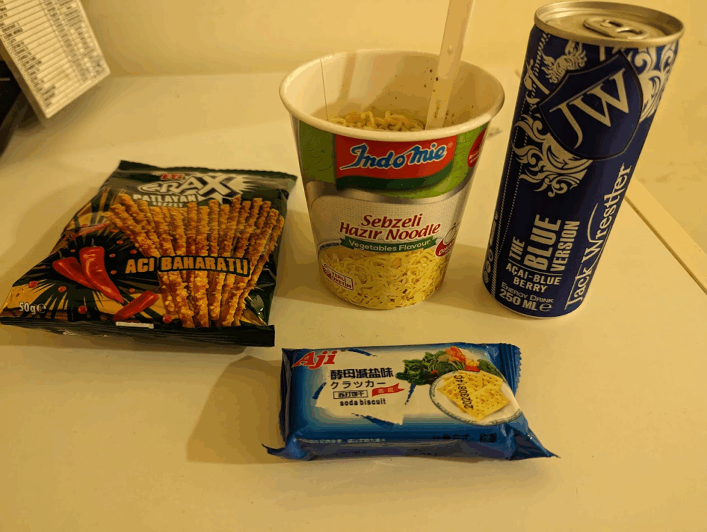昼過ぎには限界が来て仮眠。夕方起きると気分は回復したが、この日は部屋にこもることに。夕食はホステルでもらったカップラーメンと機内食で出たクラッカーなど。こういうときこそありがたみが増す。