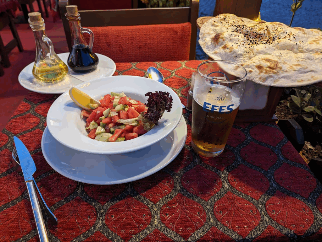 とりあえず頼んだのは、ビールとサラダ、そして茄子の肉詰めのような料理。