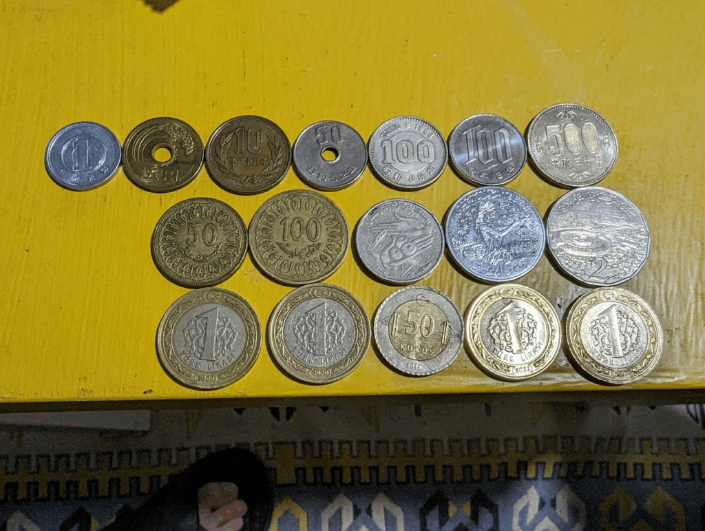 お互いの国の硬貨を交換した。上の並びから日本、チュニジア、トルコ