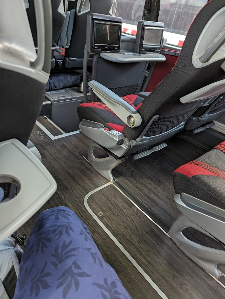 ここまで乗ってきたバスだが、想像以上に快適だった。まず、シートの後ろにモニターがついていて、飛行機のような機内サービスが楽しめるようになっていた。また、出発時には全員に水が配られ、途中でコーヒーとお茶菓子まで配られた。