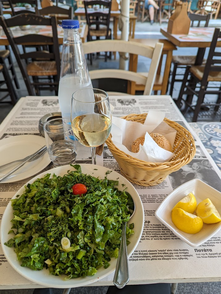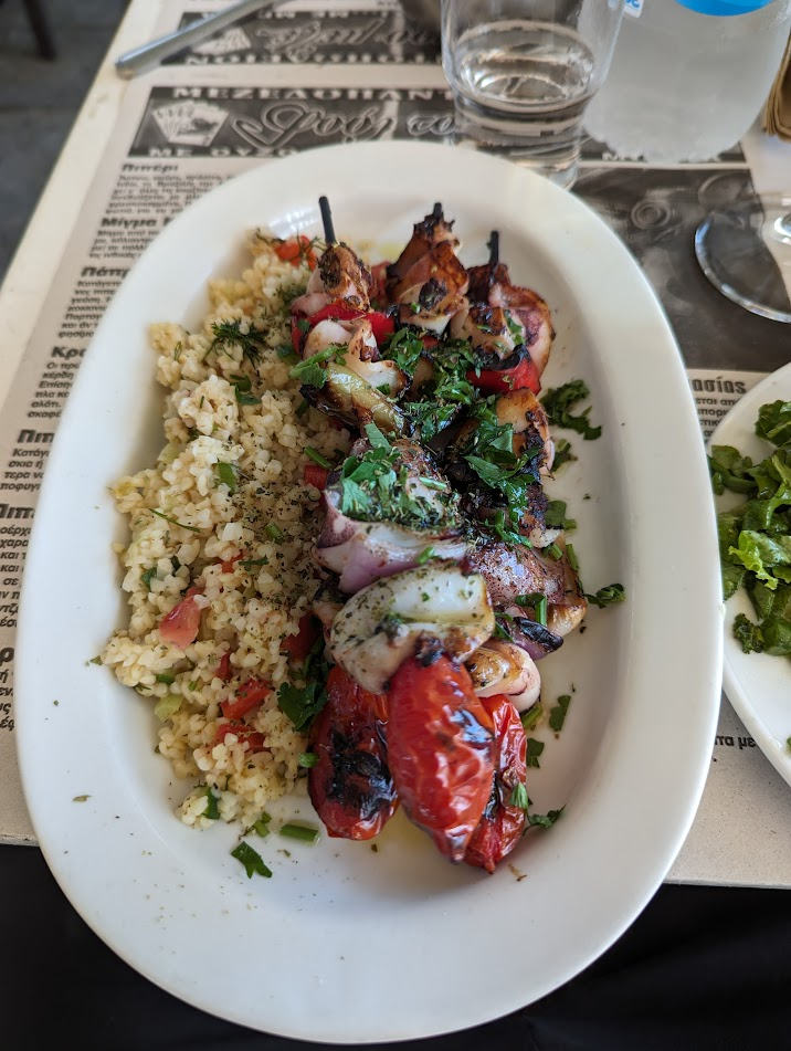 とりあえずギリシャ料理を食べてみたいので席につき、サラダとイカの串焼き、そしておすすめの白ワインを注文した。最初に来たサラダがまさかの3人前はありそうな多さだった。レタスやハーブ、ネギなどの野菜にオリーブオイル仕立てのドレッシングがシンプルだが非常にうまい。